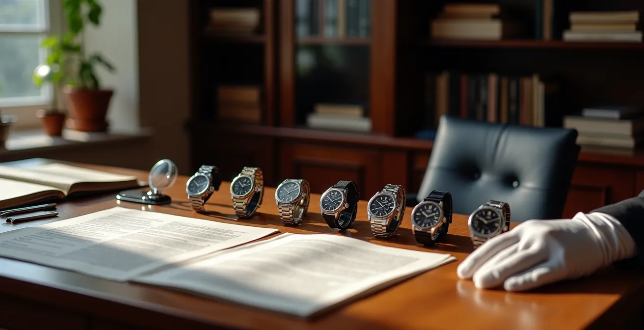 Pour compléter votre livre de bord, une expertise officielle est indispensable. Les commissaires-priseurs réalisent une estimation gratuite et confidentielle. Ce processus rigoureux croise l’identification de la pièce (marque, modèle, numéros), l’examen technique du mouvement et des composants, l’évaluation de son état (polissages, rayures) et une analyse fine du marché. Comme le soulignent les experts, cette estimation est fondée sur le marché réel des ventes publiques, offrant ainsi une base de valeur objective et défendable face à l’administration fiscale.